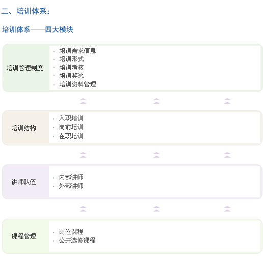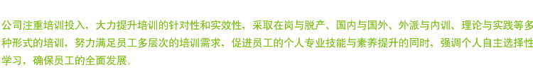 公司为员工建立基础、专业与管理三条培训通道,从而为更多专业类人才提供全方位的学习机会和恰当的个人发展空间。同时明确了各个岗位员工的能力要求,指明员工的发展方向,并帮助员工制定个人发展计划,有针对性的提升。